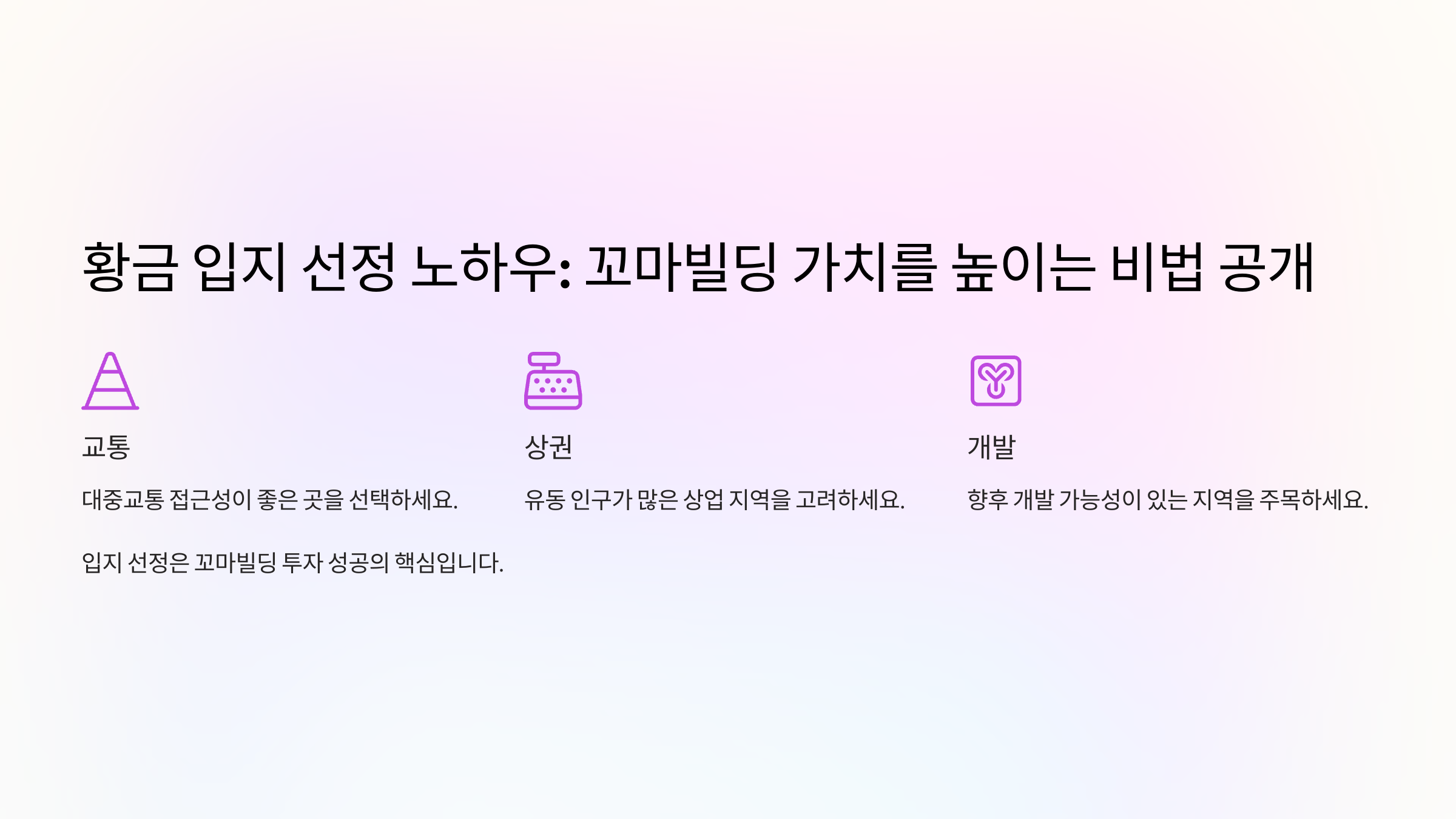입지는 꼬마빌딩 투자에서 가장 중요한 요소예요. 역세권, 상권 활성화 지역, 유동인구가 많은 지역 등이 좋은 입지로 꼽혀요. 또한 건물의 상태, 주변 임대료 수준, 공실률 등을 철저히 분석해야 해요.