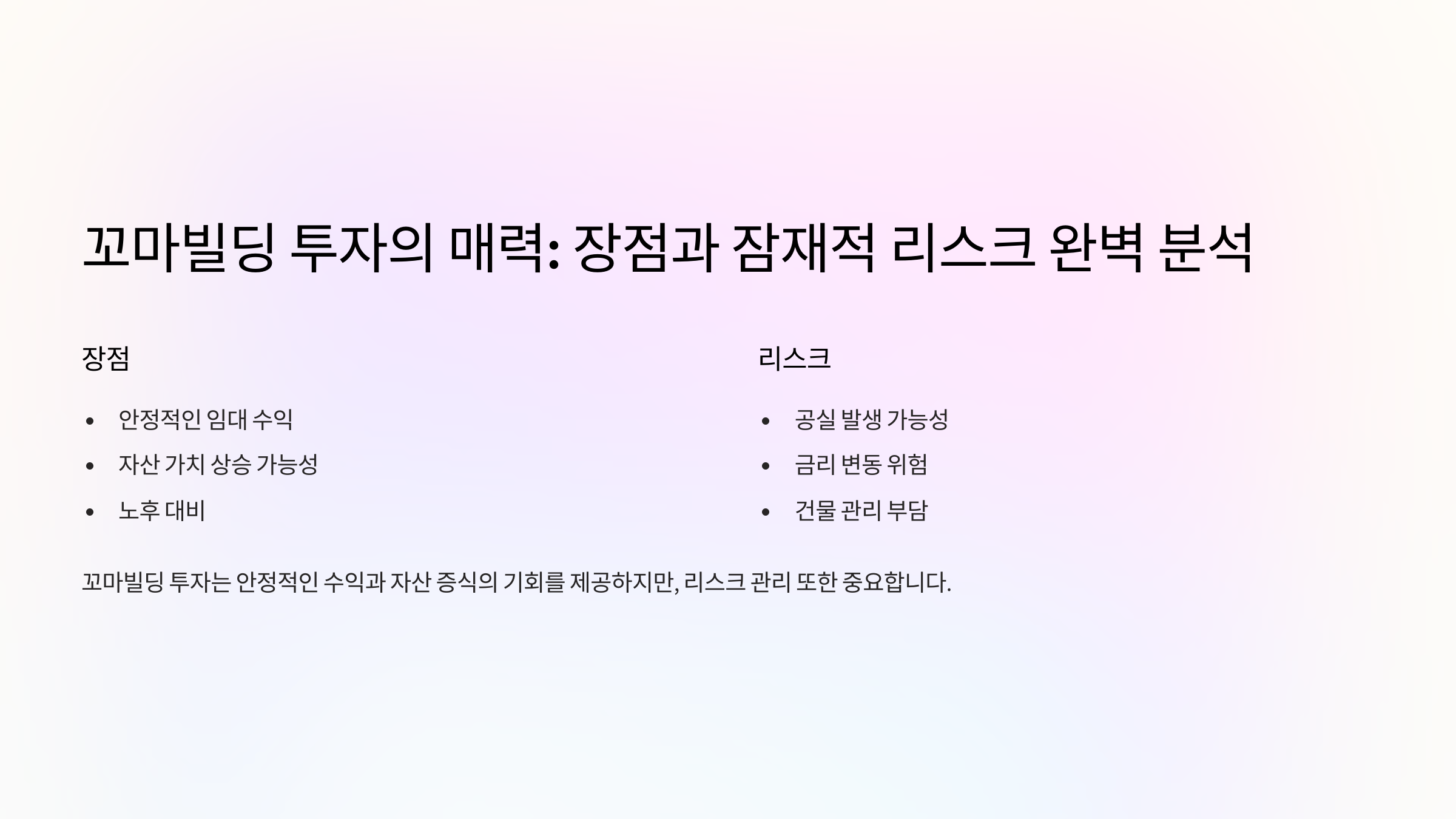 꼬마빌딩 투자는 안정적인 수익을 기대할 수 있다는 점에서 많은 사람들이 관심을 가지는 투자 방식이에요. 하지만 모든 투자가 그렇듯이 장점과 함께 리스크도 존재하기 때문에 신중하게 접근해야 해요.