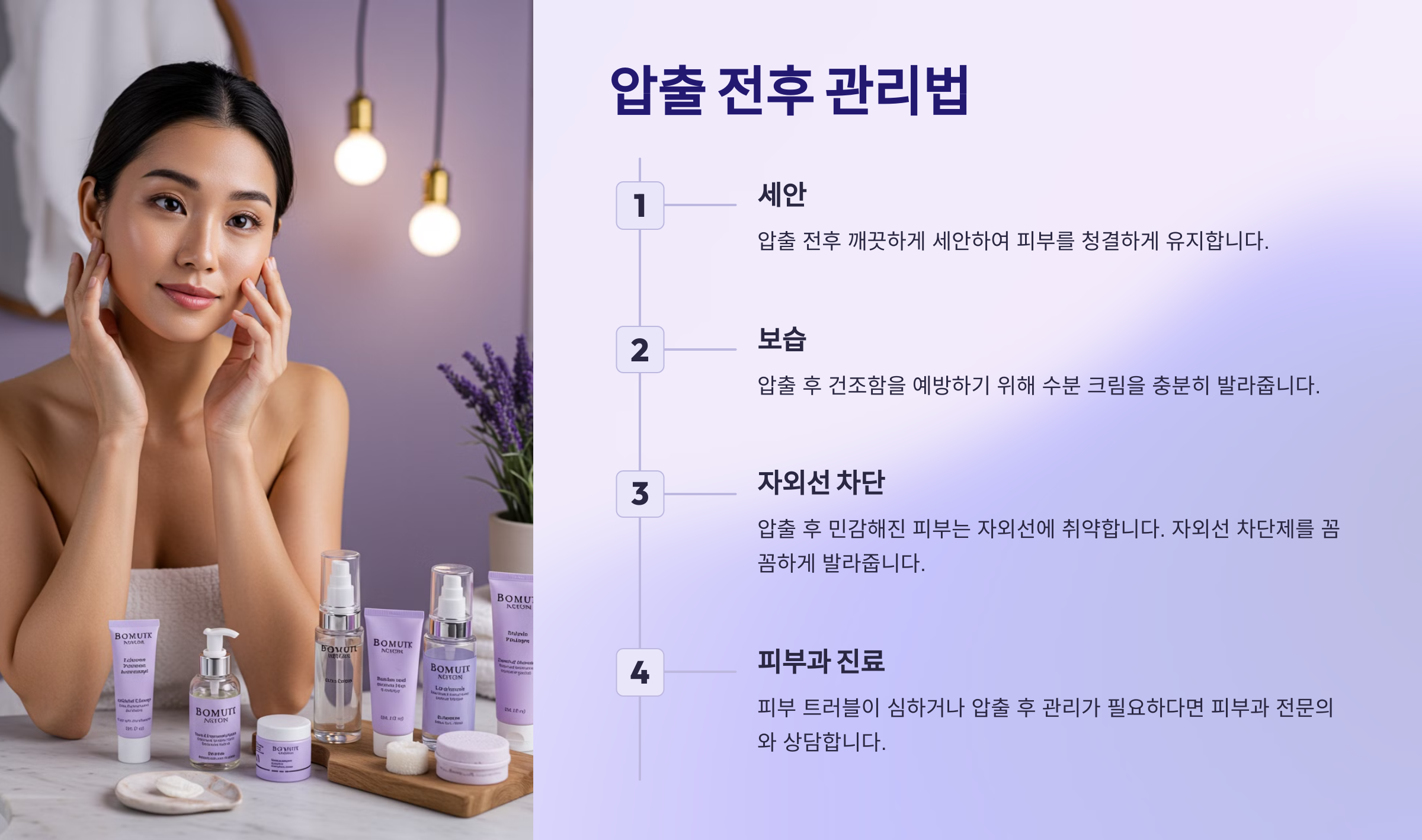 압출 후에는 즉각적인 진정 관리가 필요해요. 자극을 줄이기 위해 피부를 문지르거나 만지지 않아야 해요. 또한, 여드름이 있던 부위에 진정 크림을 바르고, 보습 관리를 철저히 해야 해요. 피부 재생을 도와주는 성분이 포함된 제품을 사용하는 것도 추천해요.