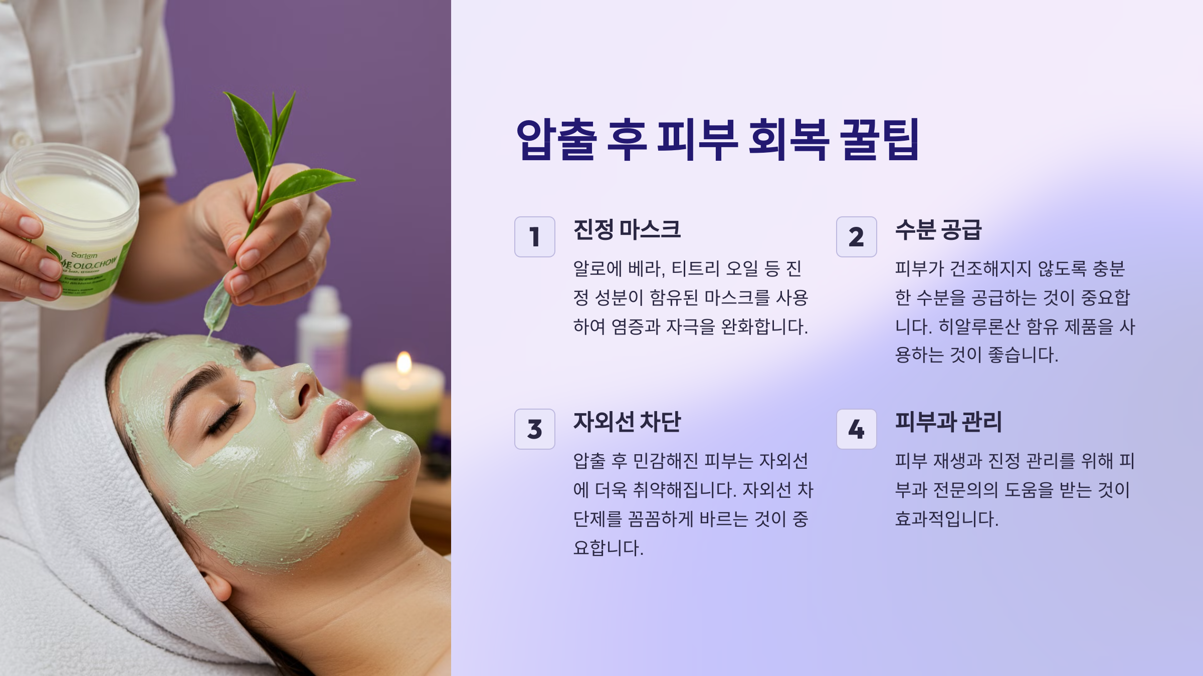 A3. 압출 후 즉각적인 진정 관리와 자외선 차단이 중요해요. 또한, 피부 재생을 돕는 크림을 사용하면 흉터를 예방할 수 있어요.