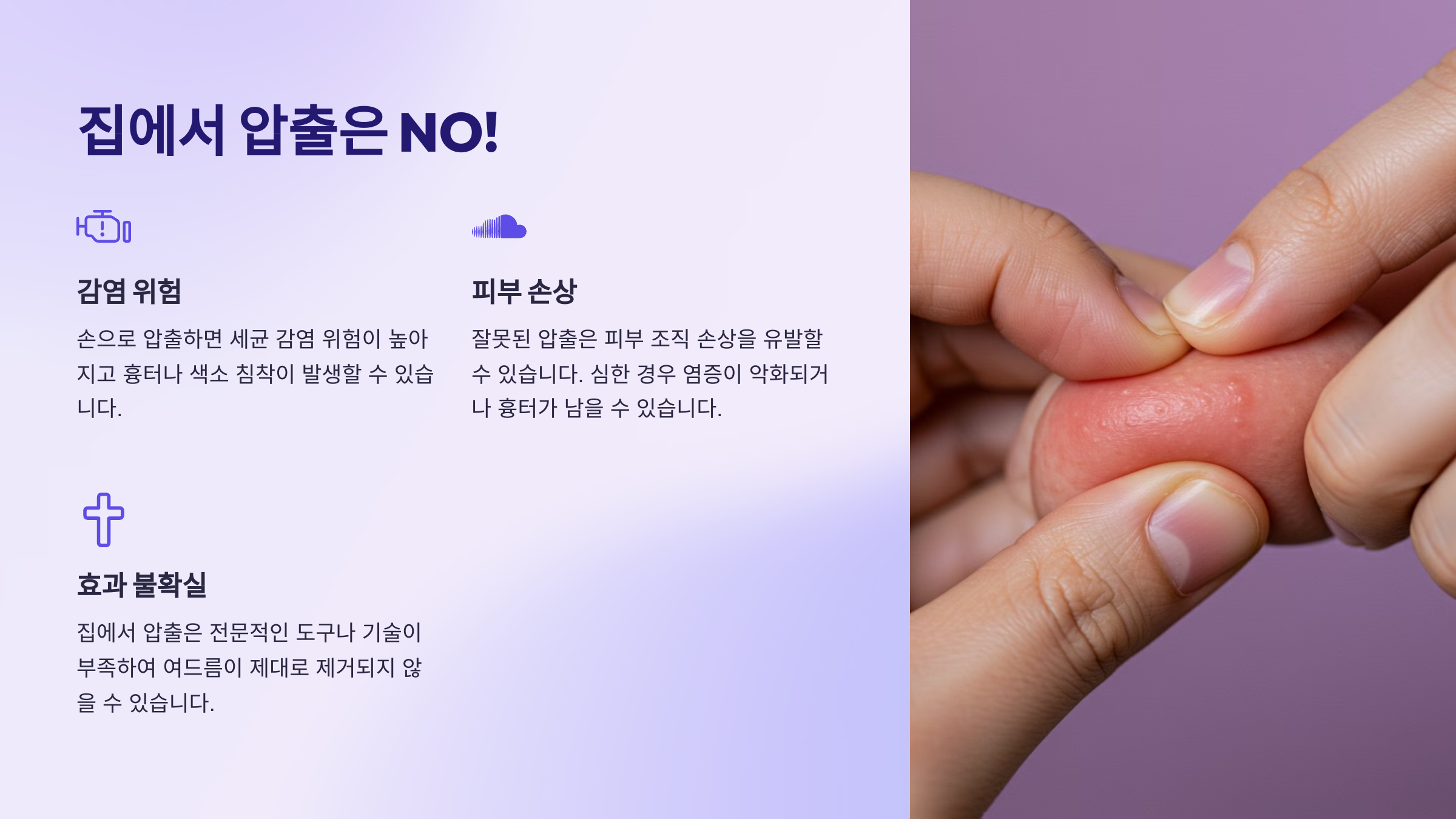 A1. 집에서 여드름 압출은 감염과 흉터의 위험이 크기 때문에 권장되지 않아요. 반드시 피부과 전문의의 도움을 받는 것이 안전해요.