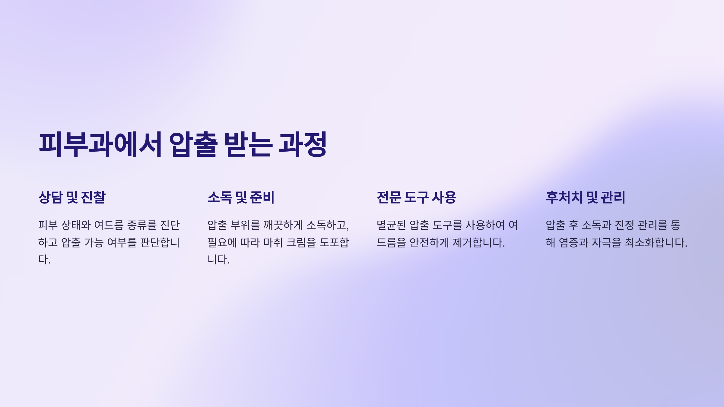 피부과에서 여드름 압출은 단계별로 체계적으로 이루어져요. 먼저 피부 상태를 전문적으로 진단한 후, 여드름의 염증 정도와 위치를 파악해요. 이를 통해 압출이 필요한 여드름을 결정하고, 불필요한 압출로 인한 피부 자극을 줄일 수 있답니다.