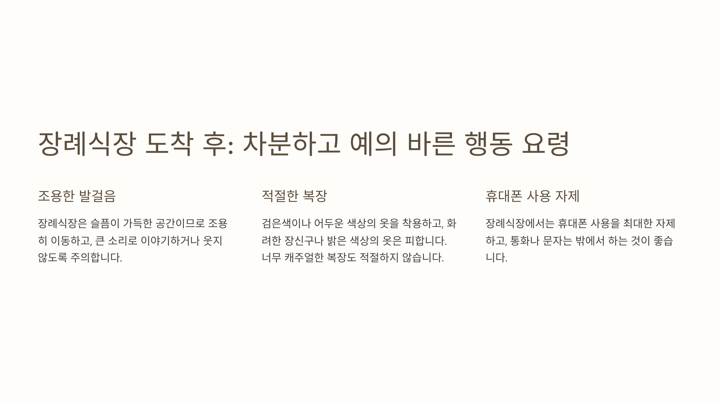 장례식에서 가장 기본적인 것은 복장이에요. 검은색 정장이나 어두운 계열의 단정한 옷을 입는 것이 예의예요. 남성은 검정 양복과 흰색 셔츠, 검정 넥타이가 기본이고, 여성은 검정 원피스나 단정한 블라우스를 입는 것이 좋아요. 지나치게 화려한 액세서리는 피하는 게 좋겠죠.